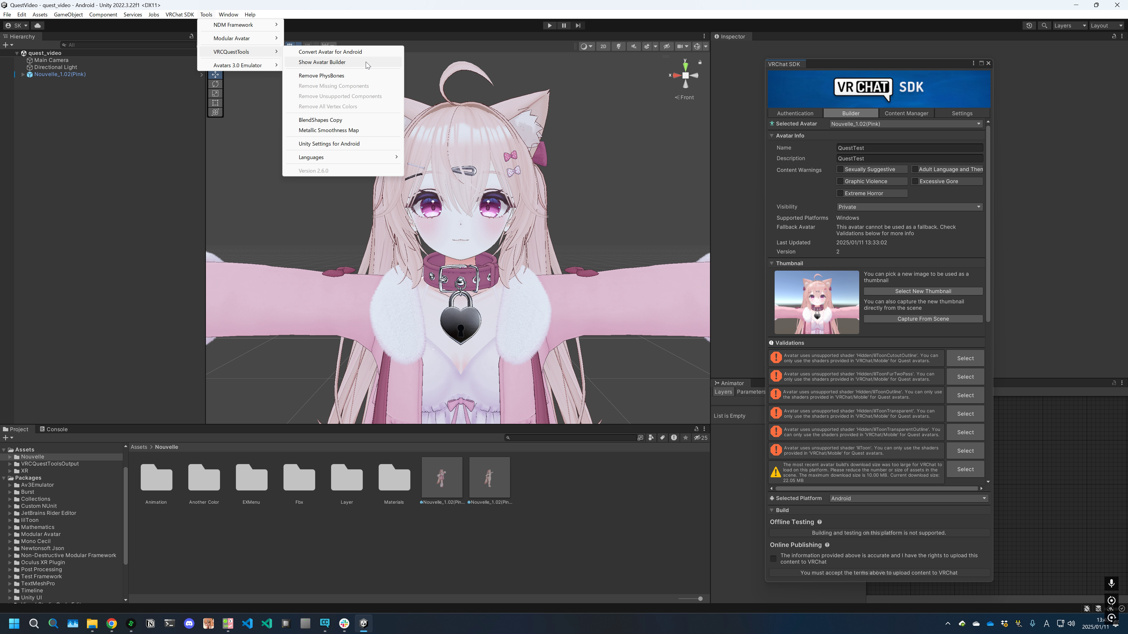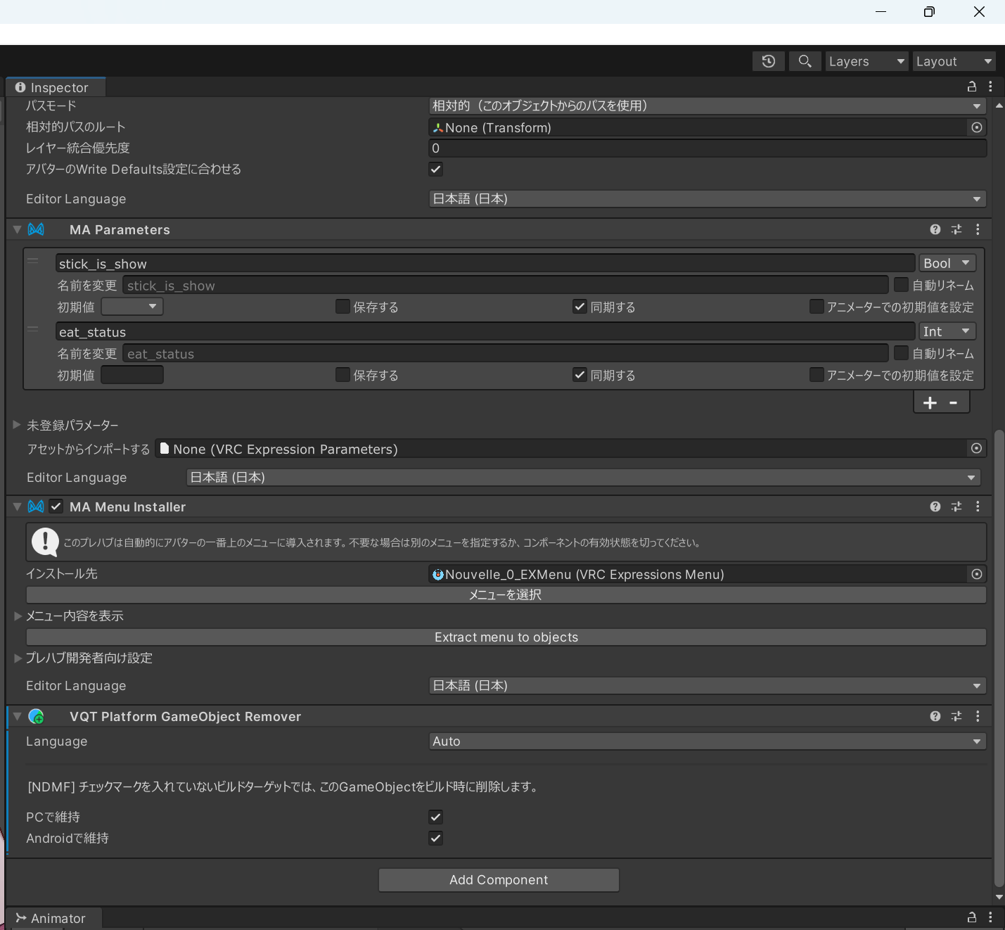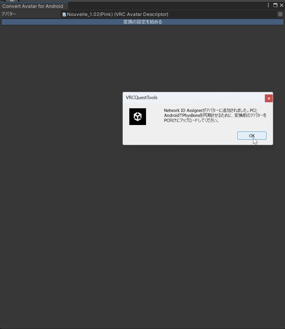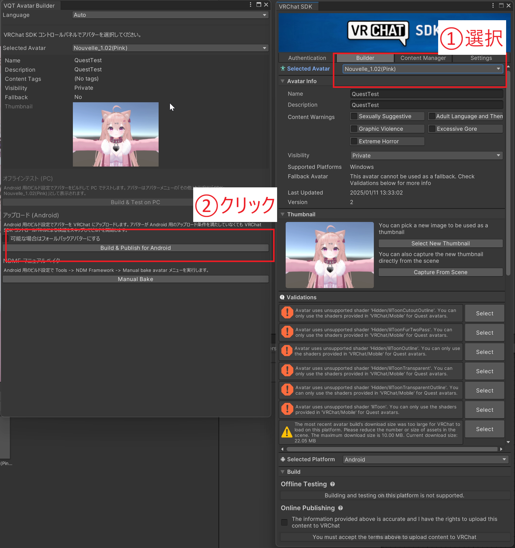 そのあと,VRCQuestToolsでアップロードすると,透過レイヤーの設定ができました!