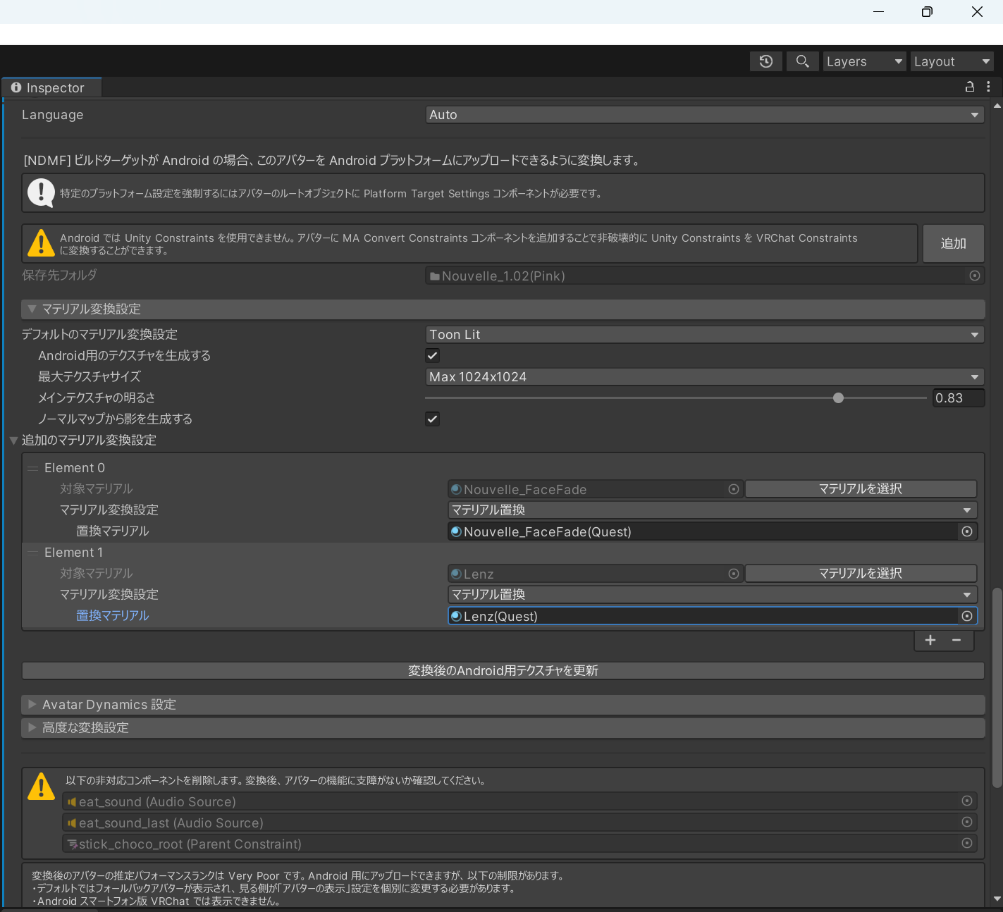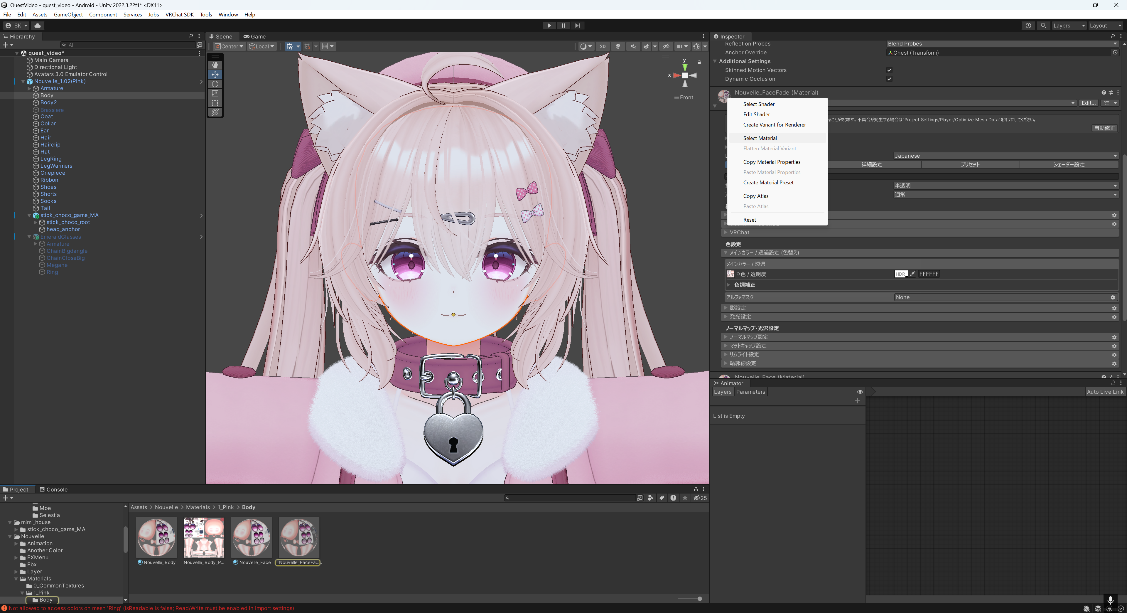 そのあと,透過がうまくいかないPCアバター用のマテリアルと先ほど複製してシェーダを変更したAndroidアバター用のマテリアルを選択します.