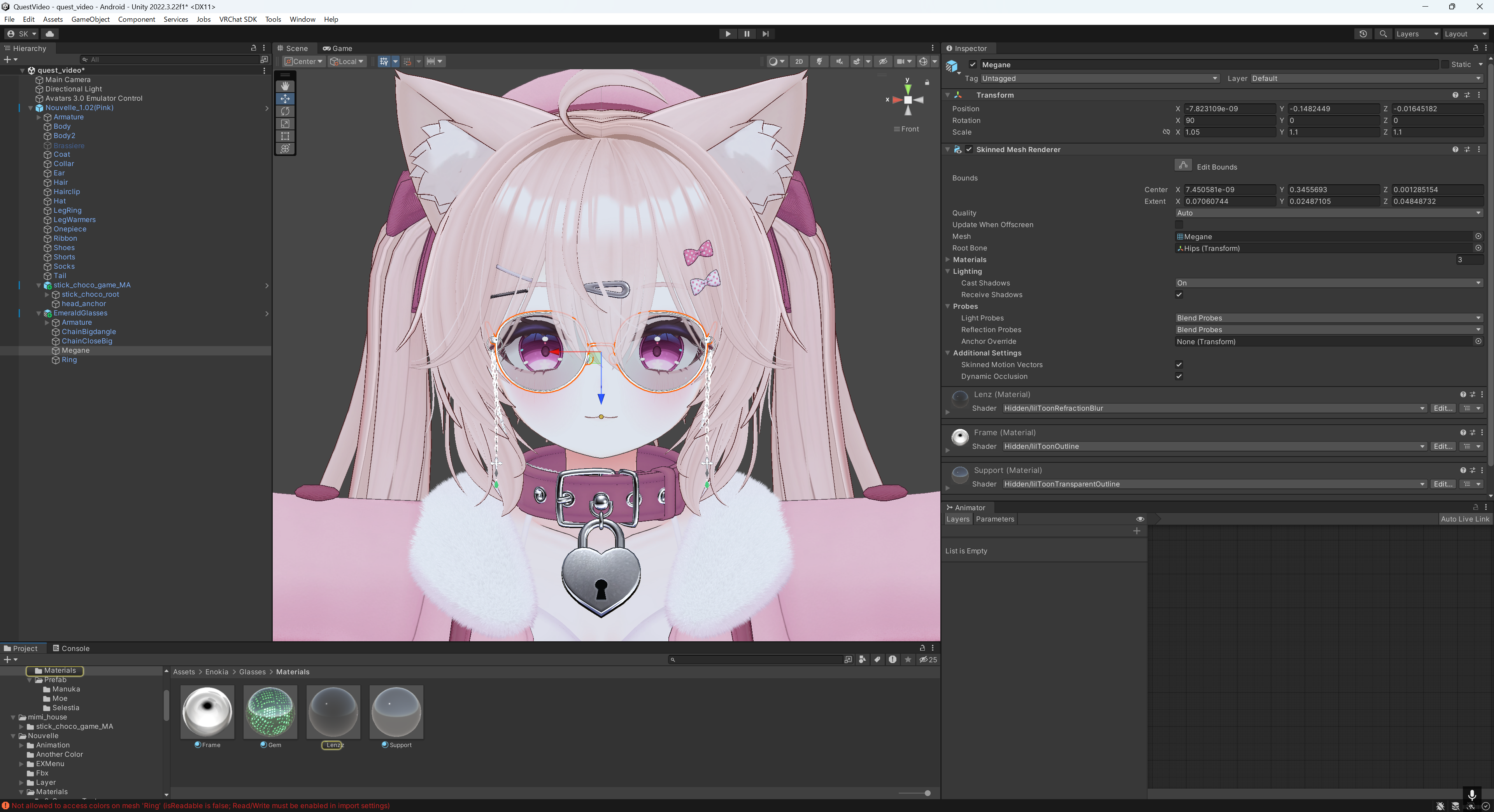 アバターの頬の透過レイヤーは,VRC QuestToolsの便利な機能(VQT Platform GameObject Remover)で紹介した海苔ブロッカーを導入すると簡単に対策できますが,例えばメガネといったアクセサリの透過レイヤーにも同様の問題が発生します.
